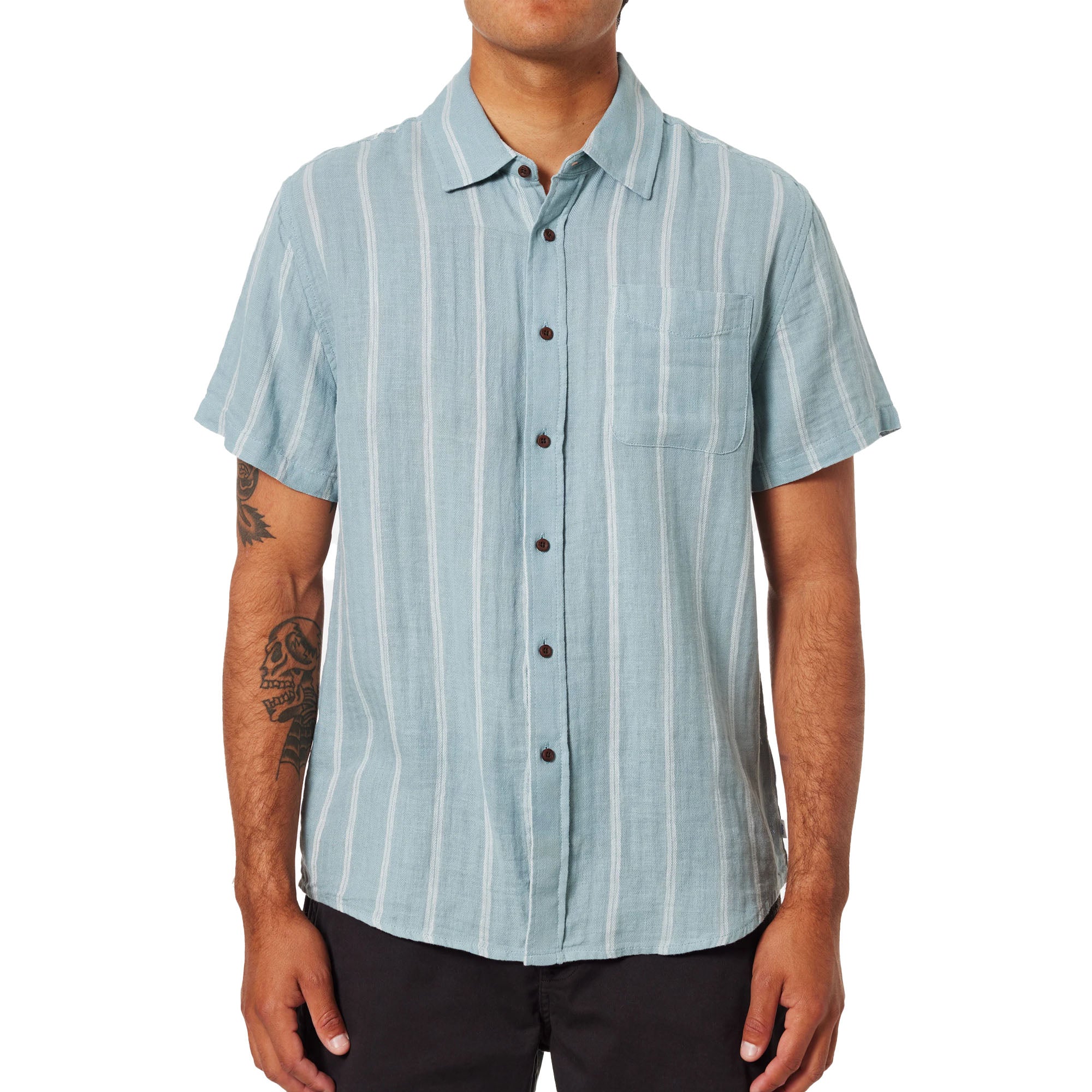 The Katin Alan Men’s S/S Woven Shirt features a custom vintage-inspired striped allover pattern atop a breathable cotton/linen button.